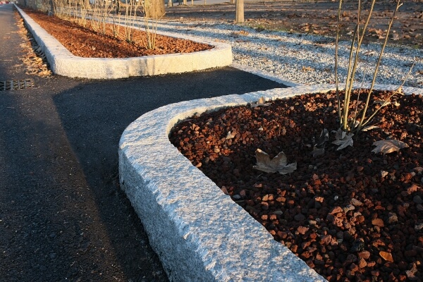 In queste due immagini i cordoli in granito sono stati usati per la realizzazione di aiuole dal doppio uso: allontanare le auto dalla pista ciclabile a fianco, e abbellire la strada. Nonostante il tempo e gli agenti atmosferici i cordoli sono belli e mantengono sia il colore che la lavorazione in maniera impeccabile.