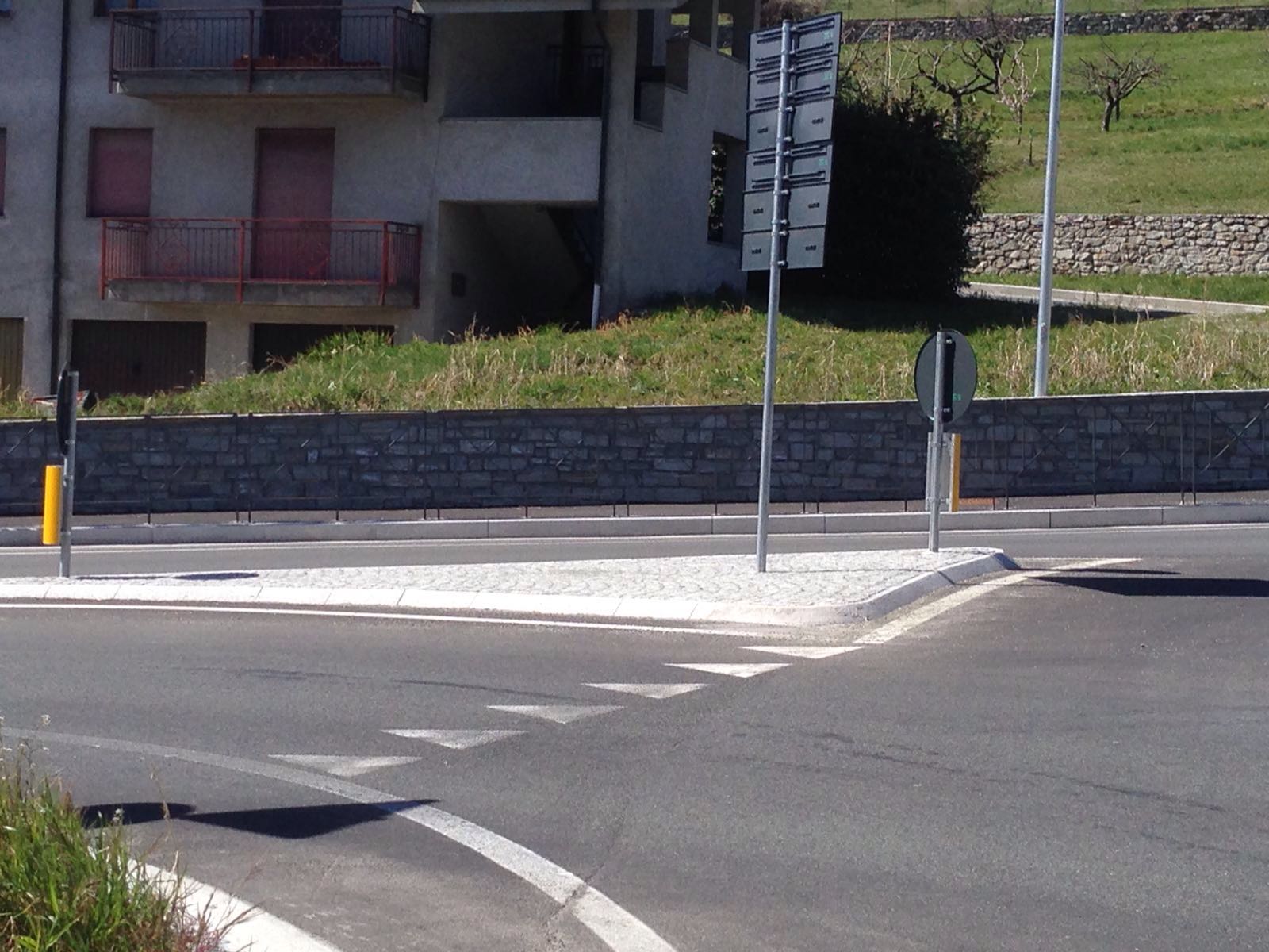 Rotonda stradale con cordoli in pietra naturale Cuneo e sfondo montano.