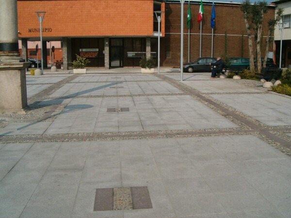 La piazza di fronte al municipio è stata pavimentata con lastre di granito grigio piano a vista bocciardato dai lati segati di dimensioni 50×50. Il disegno è stato magistralmente realizzato dai nostri operatori usando le lastre con piccole zone di acciottolato. Il risultato è decisamente armonioso, non trovate? Vorremmo porre l’attenzione anche sui dissuasori che abbiamo impiegato sia nella parte di confine con i giardinetti (nella foto a destra) che frontalmente, proprio nei pressi dell’ingresso del municipio.