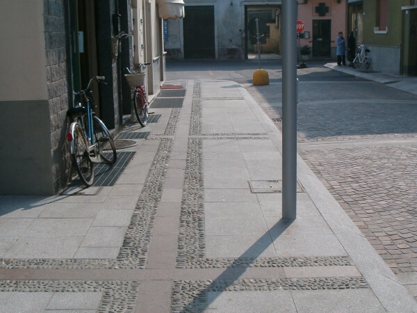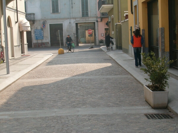 La strada è stata realizzata invece con cubetti in pietra, alternati da lastre in granito. Da notare la struttura del marciapiede che richiama il disegno della piazza grazie alla presenza di piccole strisce di acciottolato che creano armonia e movimento.