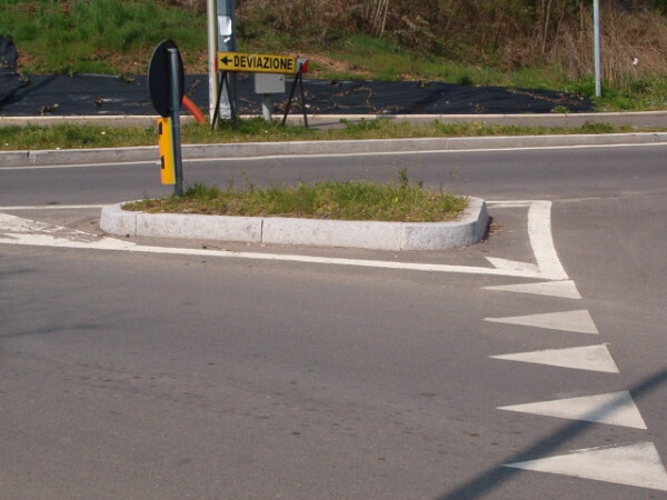 Le isole di traffico sono realizzate con cordoli in granito grigio con 2 facce a vista bocciardate corredate da smusso e lati segati. È possibile notare dall’immagine successiva, anche pezzi specifici per la curva.
